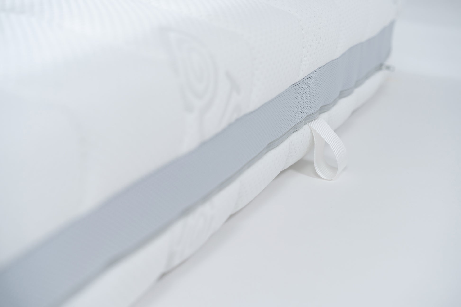 Die Matratze ist wendbar und bietet zwei Härtegrade (H2 & H3) für individuellen Liegekomfort. Vier Wendeschlaufen erleichtern das Drehen und Wenden.